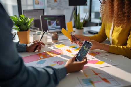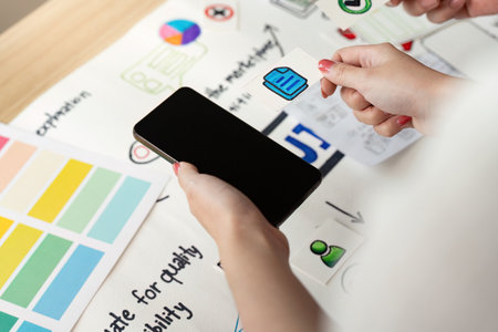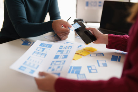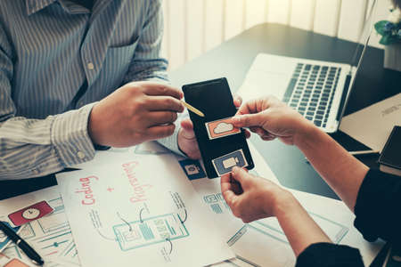Close-up of UX web developer planing the idea on smartphone application together in modern office room