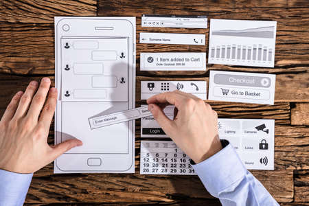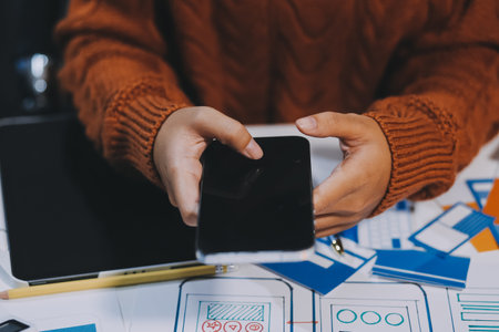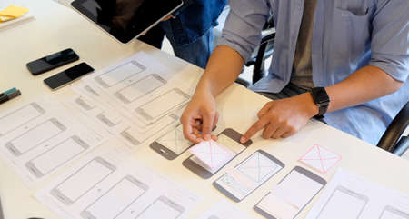 user experience (UX) designer designing web on smart phone layout. UI planning mobile application. developer work with business prototype