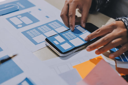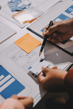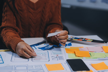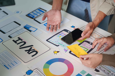 Close up ux developer and ui designer brainstorming about mobile app interface wireframe design on table with customer breif and color code at modern office.Creative digital development agency