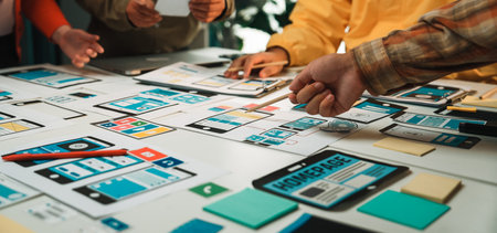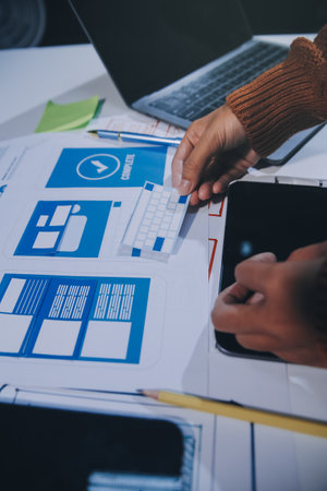 Top view of software developer working on Ux Ui design while team working together to brainstorm and develop wireframe prototype designing at creative digital company. Teamwork concept. Convocation.