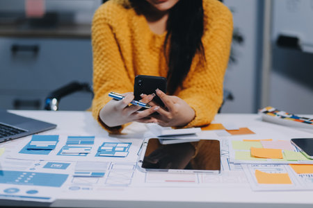 user experience, UX designer designing web on smart phone layout. UI planning mobile application. developer work with business prototype