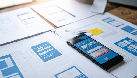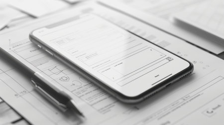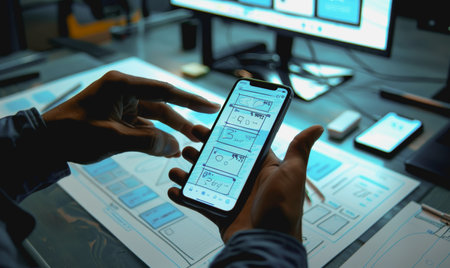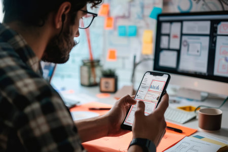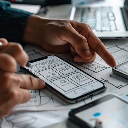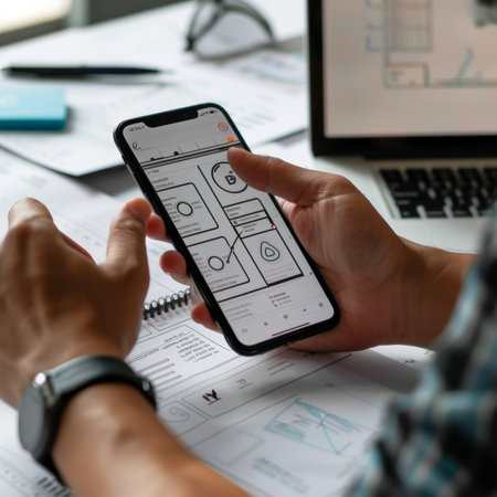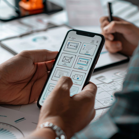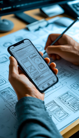 Mobile app developer brainstorming smartphone UI/UX design prototype.