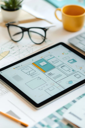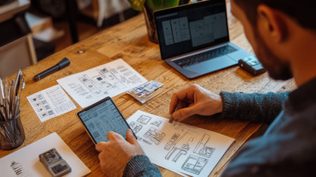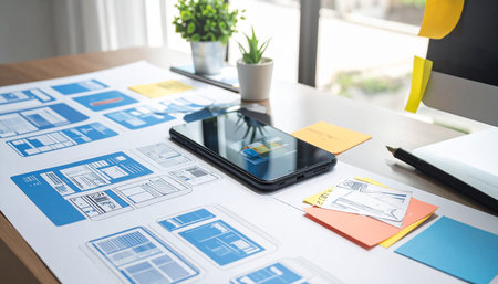 An organized workspace featuring sketches, digital devices, and creative tools used in mobile app design. The scene showcases the design process, highlighting brainstorming and planning with effective visual aids.