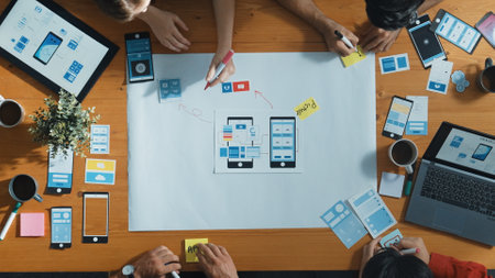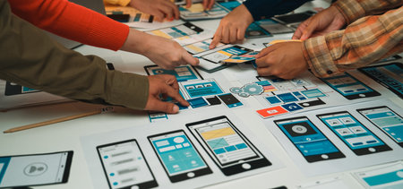 A collaborative workspace shows a diverse team engaged in user interface design. Various devices and notes spread out showcase brainstorming and innovative planning processes.