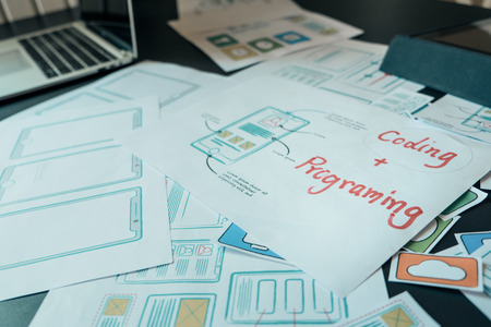 user experience, UX designer designing web on smart phone tablet layout. UI planning mobile application. developer work with business prototype