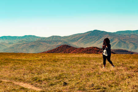 woman texting while walking in a field on top of a bald mountain in the Appalachian mountains in the fall
