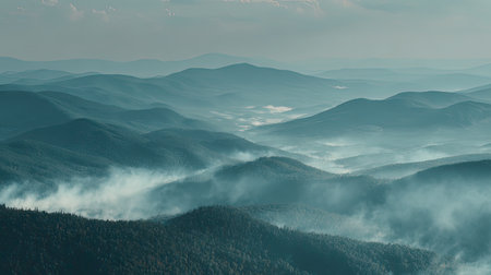 Misty mountains with layered landscape and blue sky, ethereal nature scene. Serenity and tranquility concept