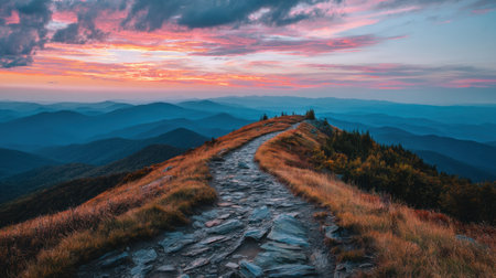 A stunning sunset transforms the mountainous landscape into a colorful masterpiece, featuring a winding stone path with lush grass and trees. Perfect for nature lovers.