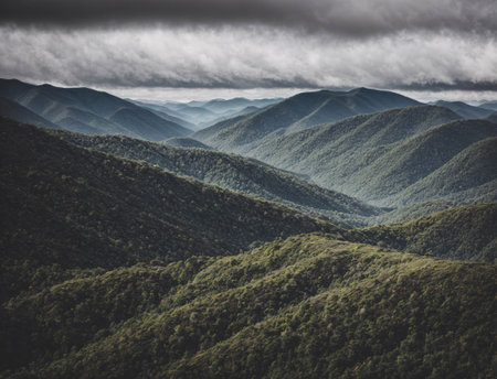 Experience a breathtaking mountain view with lush forests, rolling hills, and dramatic clouds. Discover the serene beauty of nature in a remote landscape.
