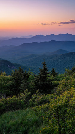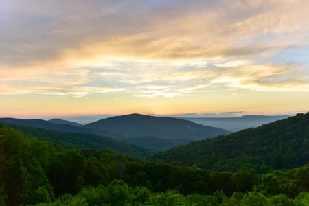 Serene Sunset Over Blue Ridge Mountains with Layers of Shadows, Vibrant Colors and Distant Peaks