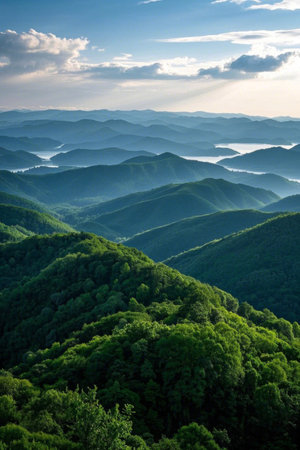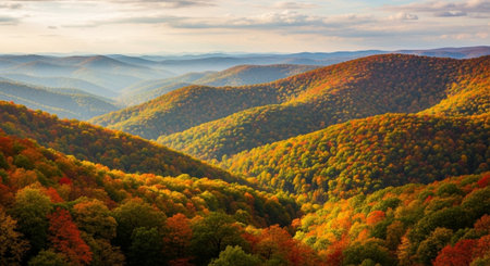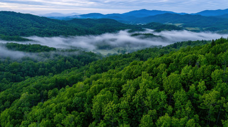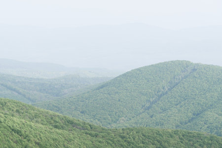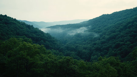 A serene view of the Appalachian Mountains with rolling hills and dense forests. No people, copy space.
