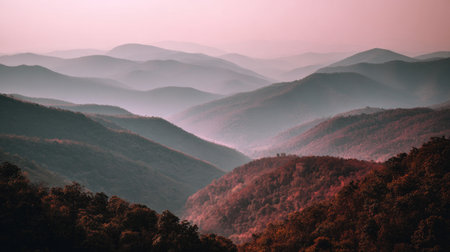 A breathtaking view of a tranquil mountain landscape at dusk, showcasing softly layered hills in pink and purple hues, evoking peace and serenity in nature.