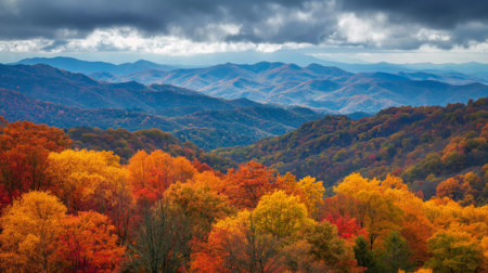 Vibrant autumn colors light up a majestic mountain range under a dramatic sky