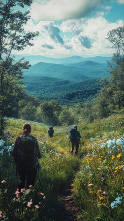 As spring unfolds, hikers trek along the Appalachian Trail, immersed in a landscape filled with colorful wildflowers and majestic mountains, creating an enchanting outdoor experience.
