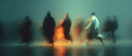 This captivating image depicts ethereal figures in a transition of motion, showcasing the interplay of light and shadow to evoke a sense of transformation and evolution.