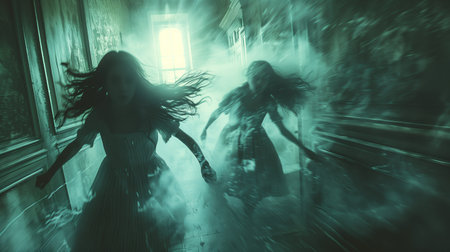 Two Girls Running Through Haunted House Hallway