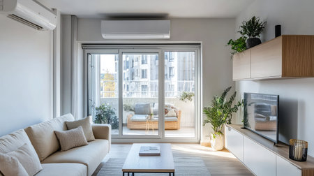 Air conditioning unit in an apartment living room, perfectly fitted into the wall with contemporary decor and cozy furnishings