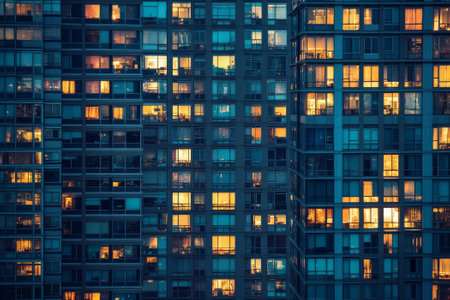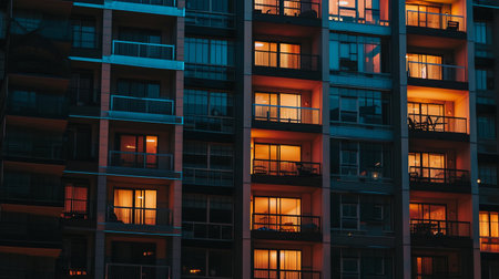 Evening view of a multi-story apartment building, showcasing lit windows in a symmetrical facade.