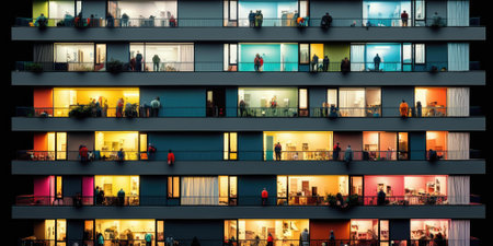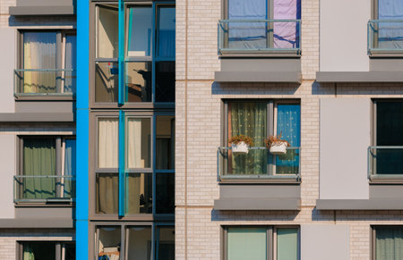 A captivating view of a modern residential building showcasing geometric patterns, vibrant colors, and large windows. Ideal for urban and architecture themes.