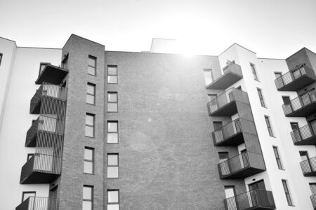 Detail of modern residential flat apartment building exterior. Fragment of new luxury house and home complex. Black and white.