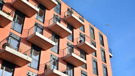Contemporary residential building exterior in the daylight. Modern apartment buildings on a sunny day with a blue sky. Facade of a modern apartment building
