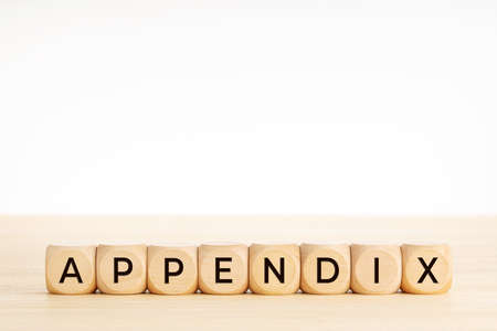 APPENDIX word on wooden blocks on wood table. Copy space. White background