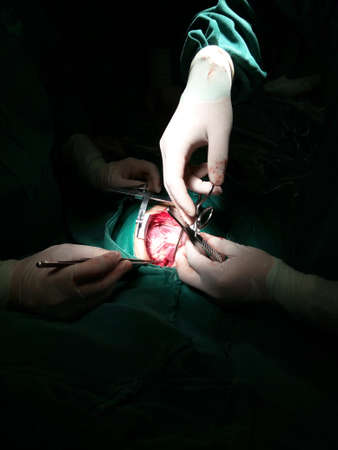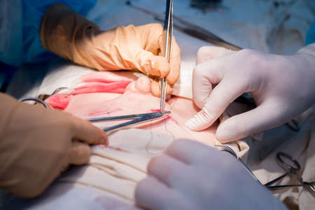 Surgery. The surgeon's assistant ties ligature over the skin. Medical intervention.