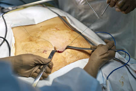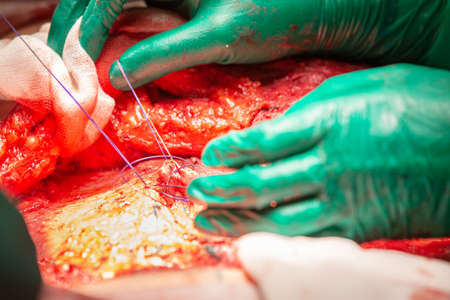 Close up of plastic surgeon hands in sterile gloves placing sutures after tummy tuck surgery in clinic. Doctor performing abdominal plastic surgery in operating room. Concept of abdominoplasty.