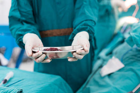 A team of surgeons perform a kidney operation in a sterile operating room. Hands of doctors, holding surgical instruments in hand, do manipulations, surgical intervention on internal organs