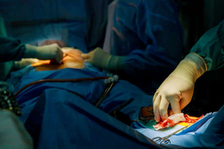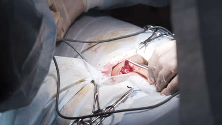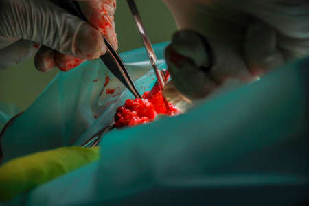 Close up details of a surgery process in a sterile room. Action. Doctors wearing safety gloves performing operation with surgery tools and saving life of a patient, medicine concept.