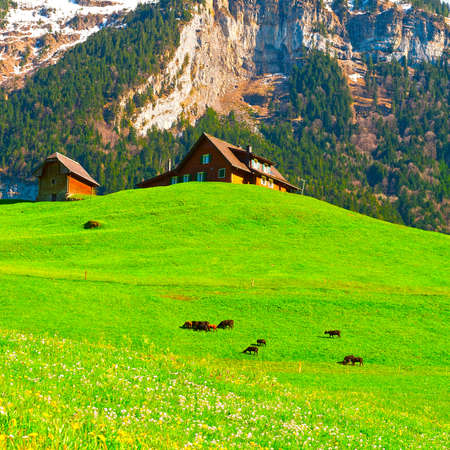 Traditional architecture and farmhouses on the slopes of the Swiss Alps by the lake Lucerne or Vierwaldstaetersee lake (Vierwaldstattersee or Vierwaldsättersee) and under the Buochserhorn mountain