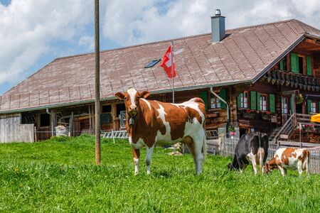 Beautiful cow with cowbell in an alpine pasture in the Swiss alps in front of a typical Swiss farm with a Swiss flag on a beautiful sunny day with blue sky with clouds