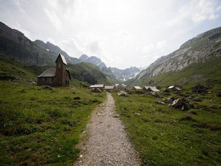 Summer view of a beautiful apline village in Switzerland. green field, footpath with wooden fence in Switzerland village.