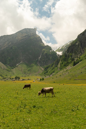 Appenzell, Switzerland, June 13, 2021 Majestic fresh green field with the summit of the alps in the background