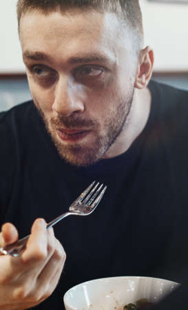 Close up of young handsome man eating salad at cafe.