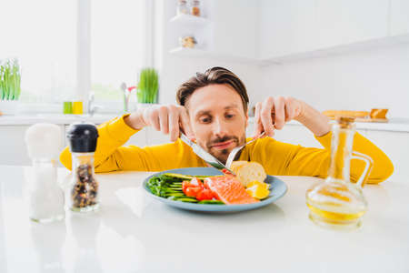 Photo of young handsome man eat yummy fish steak cuisine calories dieting organic dinner kitchenware indoors