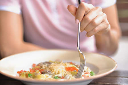 detail male hand eating pasta spaghetti with clams and mullet, Mediterranean food