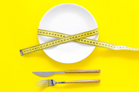 Diet for weight loss concept. Proper nutrition. Medical starvation. Empty plate with fork and knife near measuring tape on yellow background top view.