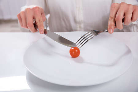 Plate with a Tomate cutten by cuttlery held by two hands