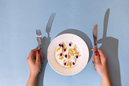Tablets, pills and capsules on a white porcelain plate. The table is set with a plate, fork, knife. Blue background with hands of the woman. Medicine and vitamins instead of food concept. copyspace.