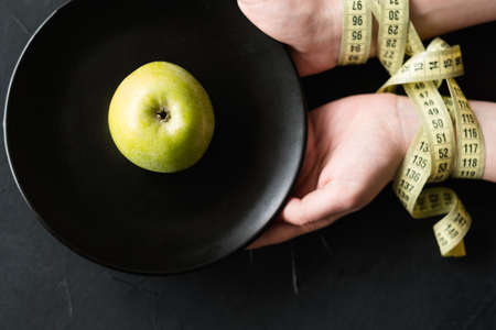 losing weight fitness and slim figure. power of will and restriction in the female fight for perfection. woman hands tied with measuring tape holding a plate with one apple
