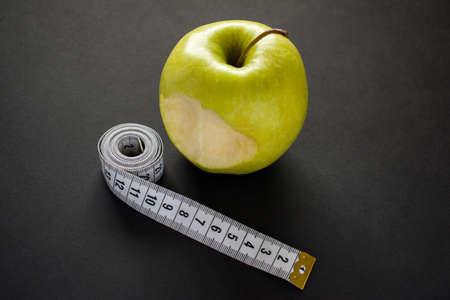 Bitten apple with measuring tape on black background