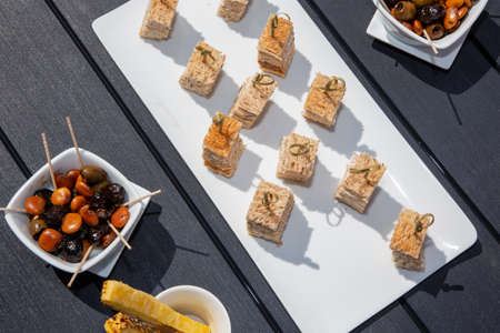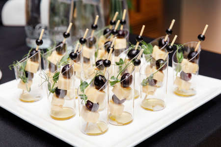 Set of canapes of cheese, olive and honey stand on the buffet table
