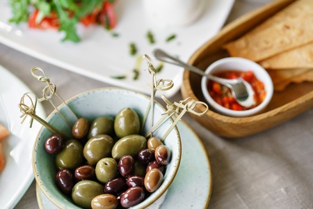The traditional Spanish appetizers of olives, tomatoes and anchovies in a white ceramic bowls, seafood