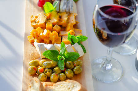 Cheese platter with cherries and bruschetta on festive table during summer lunch, wine tasting event
