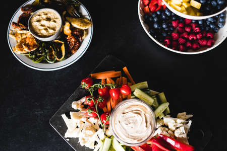 Above, food and snack platter with fruit for healthy nutrition, vegetarian diet and vitamins on table. Grapes, cheese and crackers on plate with wellness, brunch or breakfast meal and hungry eating