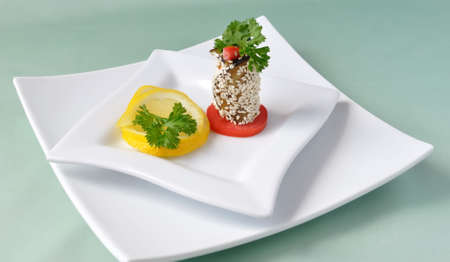 Roulade of eggplant with tomatoes in sesame seeds with lemon and herbs