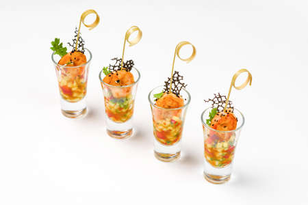 colorful fresh prawn shrimps and vegetables appetizer snack antipasto isolated over white
