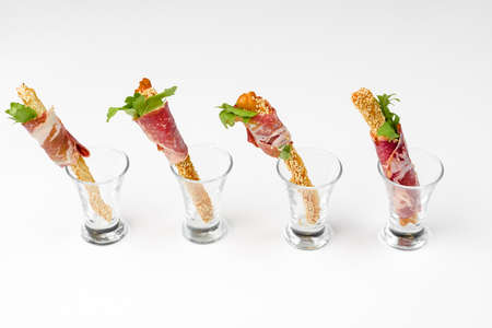 Buffet snack brisket with sesame stick in glass on a white background