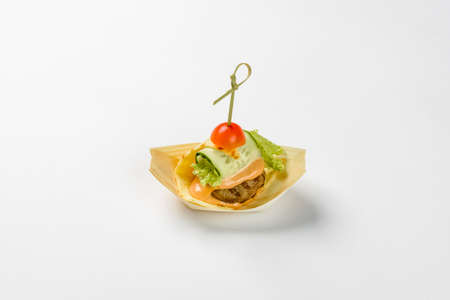 Canape with meat seafood and vegetables on a white background
